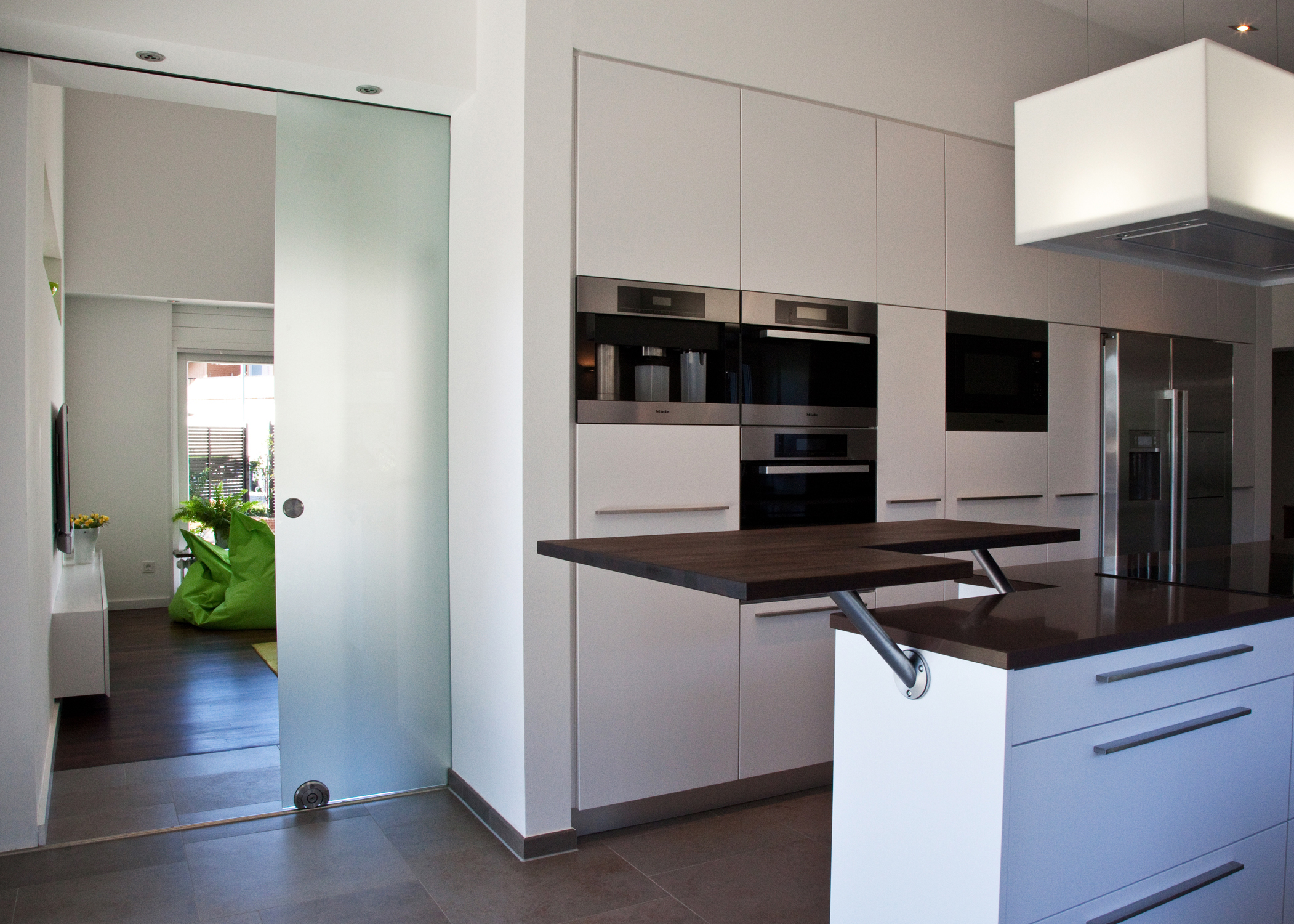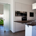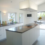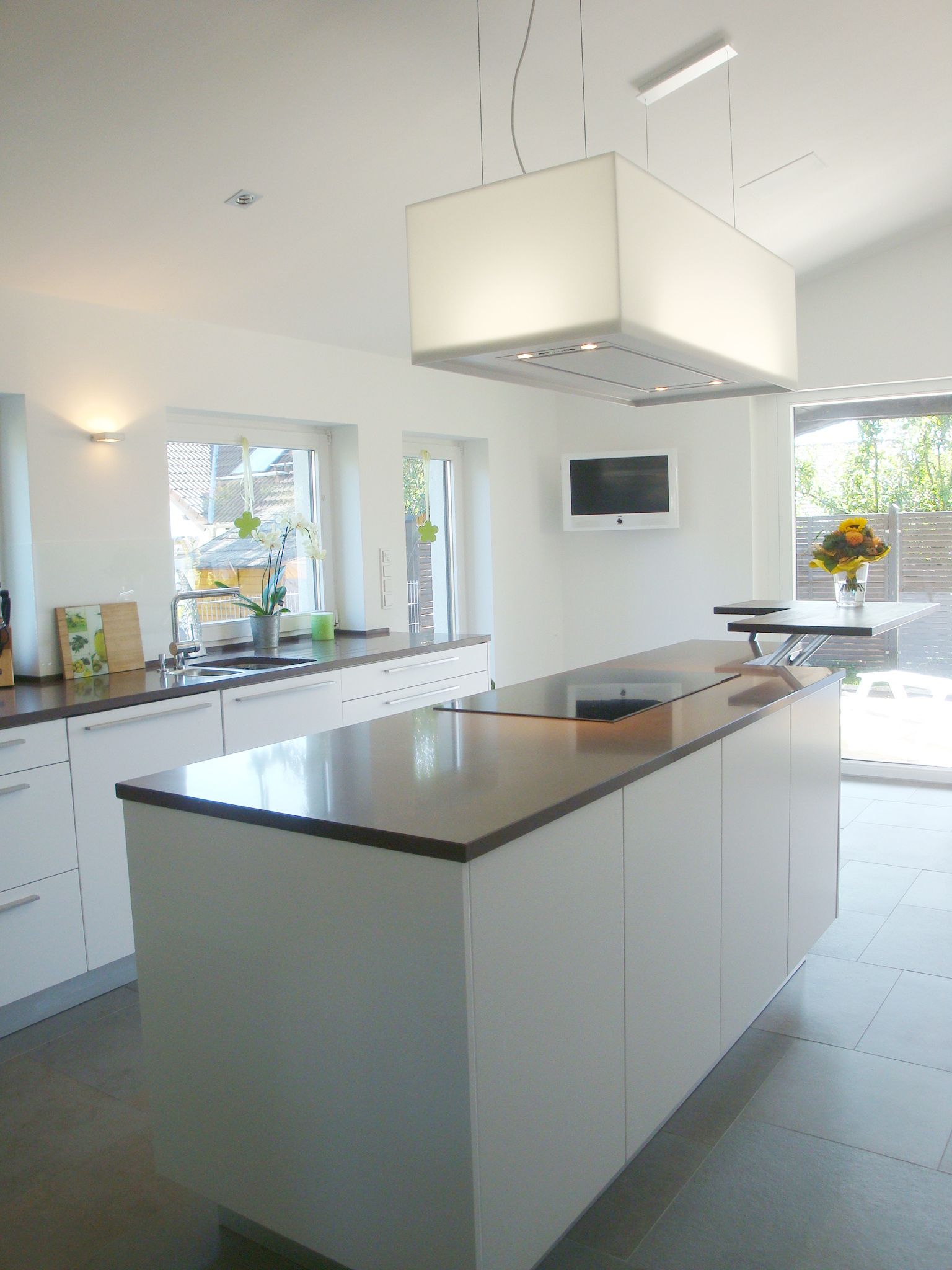 Quarz-Kompositmaterial Bezeichnung: Raven Hersteller: Caesarstone Oberflächenbearbeitung: poliert Ausschnitt für Unterbaubecken mit Sichtkante innen, CNC-gefräst Ausschnitt für Unterbau-Restebecken mit Sichtkante innen, CNC-gefräst Ausschnitt für Einbaukochfeld, wasserstrahlgeschnitten Bohrung für Armatur, wasserstrahlgeschnitten Bohrung für Excenter, wasserstrahlgeschnitten Wandanschlussprofil/Sockel, individuell