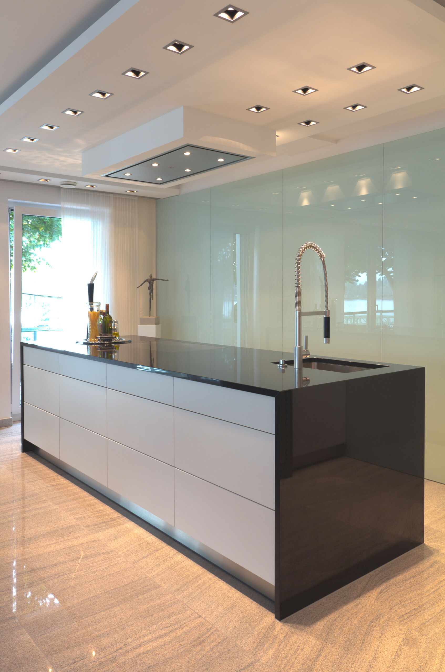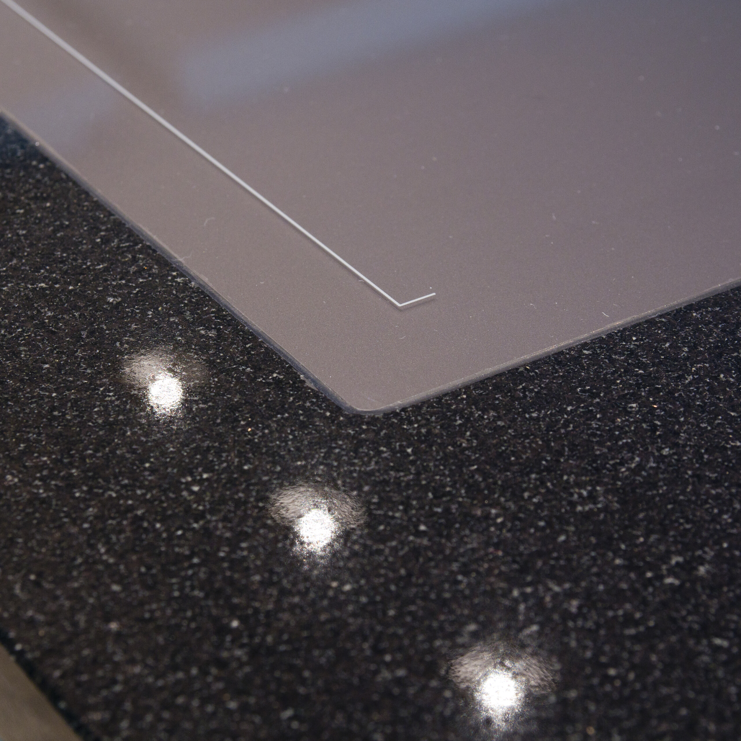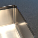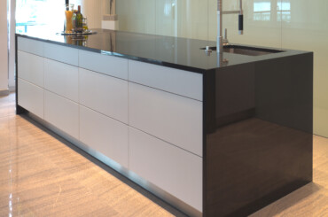 Naturstein Bezeichnung: Nero Assoluto Materialart: Hartgestein Oberflächenbearbeitung: poliert Ausschnitt für Unterbaubecken mit Sichtkante innen, CNC-gefräst Ausschnitt für flächenbündiges Kochfeld Bohrung für Armatur, wasserstrahlgeschnitten Bohrung für Excenter, wasserstrahlgeschnitten Besonderheiten: Inselplatte mit Seitenwangen auf Gehrung verklebt
