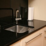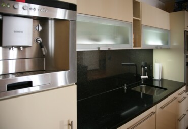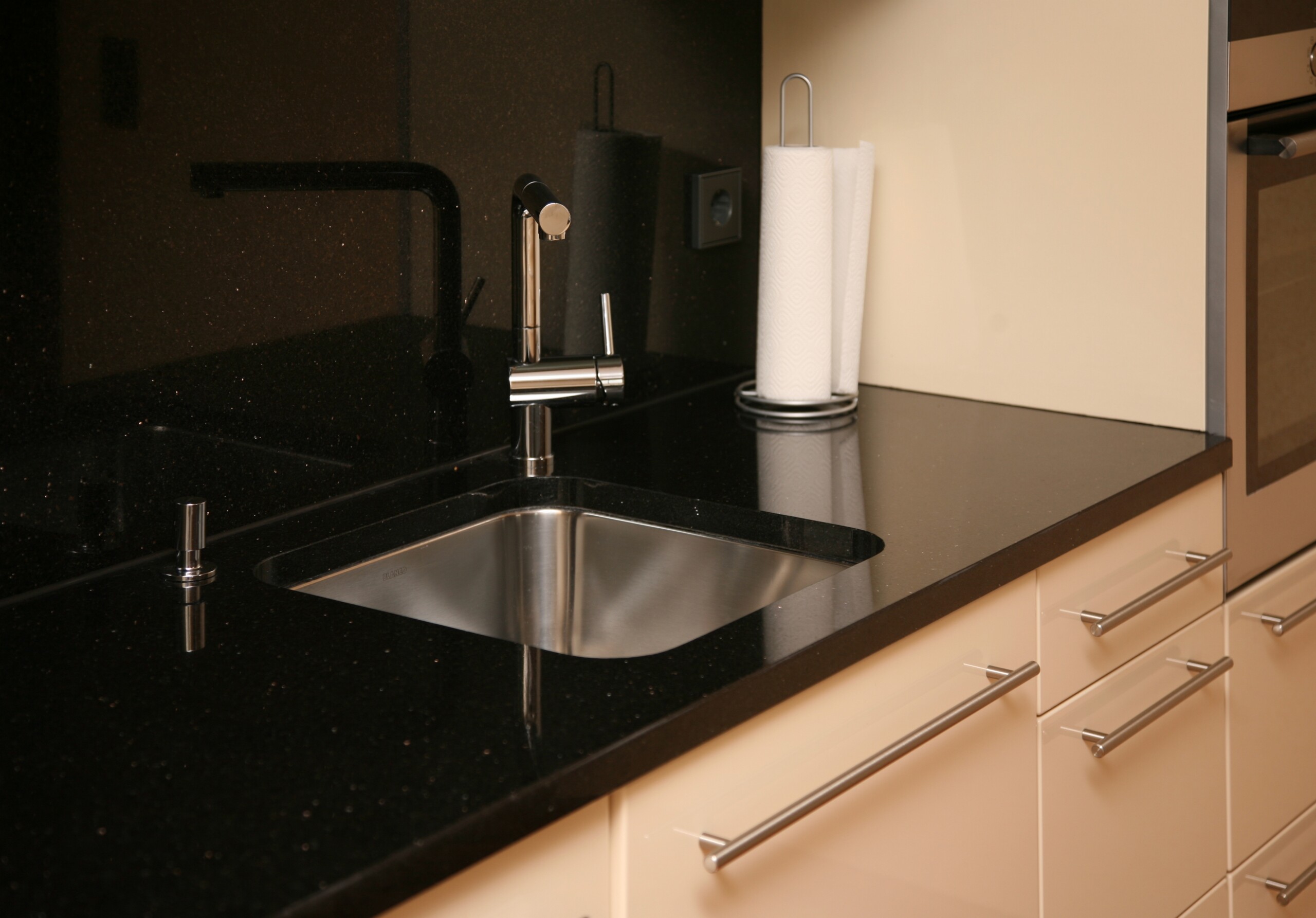 Naturstein Bezeichnung: Star Galaxy Materialart: Hartgestein Oberflächenbearbeitung: poliert Ausschnitt für Unterbaubecken mit Sichtkante innen, CNC-gefräst Bohrung für Armatur, wasserstrahlgeschnitten Bohrung für Excenter, wasserstrahlgeschnitten Rückwandverkleidung