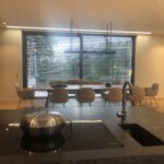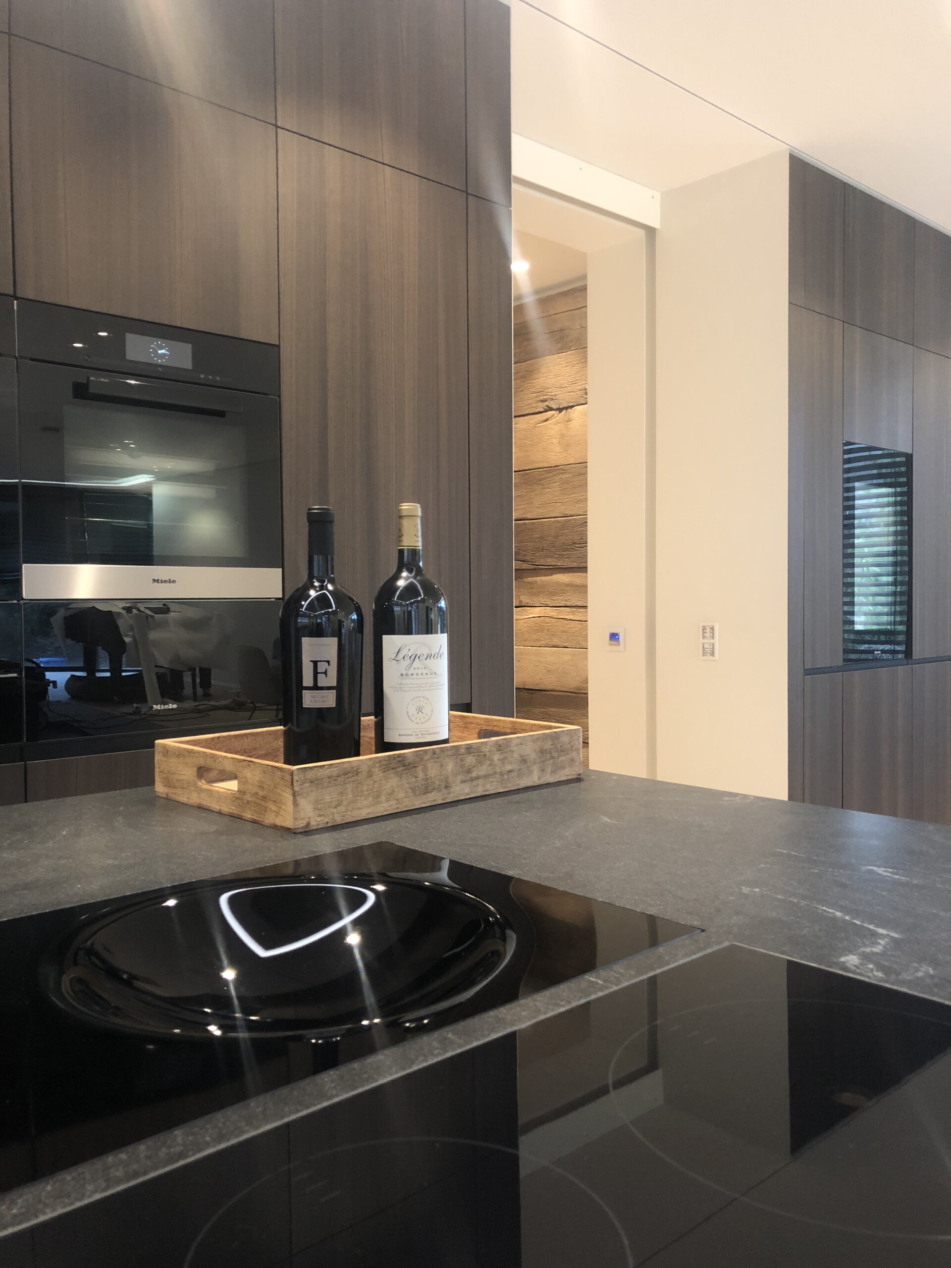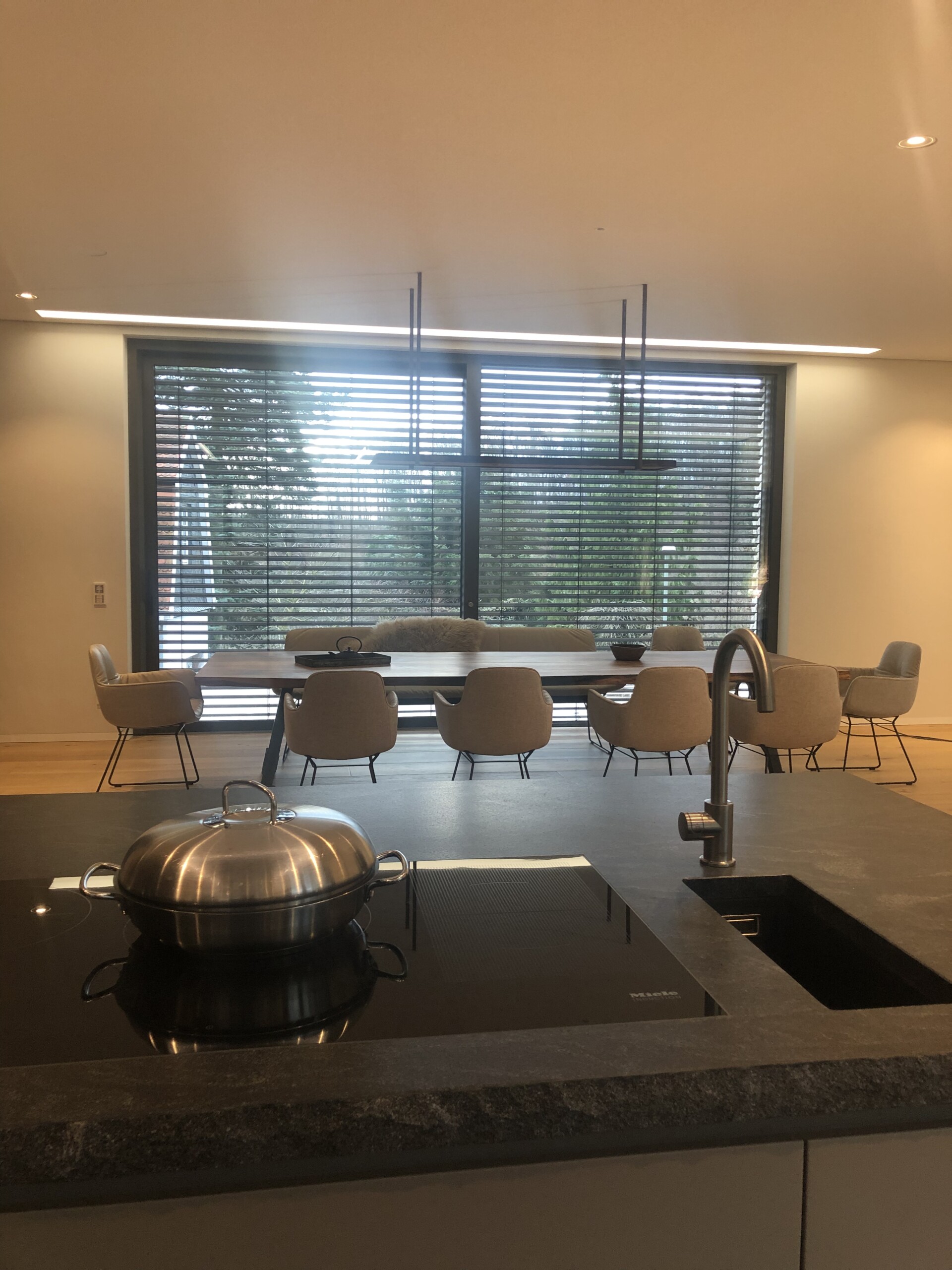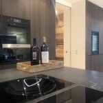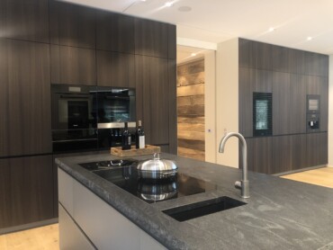 Naturstein Bezeichnung: Virginia Black Materialart: Hartgestein Oberflächenbearbeitung: satiniert Ausschnitt für Unterbaubecken mit Sichtkante innen, CNC-gefräst Ausschnitt für Einbaukochfeld, wasserstrahlgeschnitten Ausschnitt für flächenbündiges Kochfeld Bohrung für Armatur, wasserstrahlgeschnitten Kantenaufdopplung mit bruchrau bossierter Oberfläche an allen Sichtkanten, in Massivoptik auf Gehrung (45°-Verklebung)