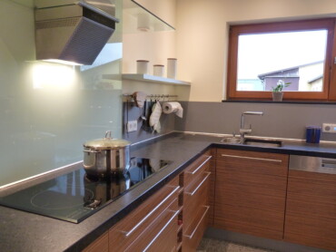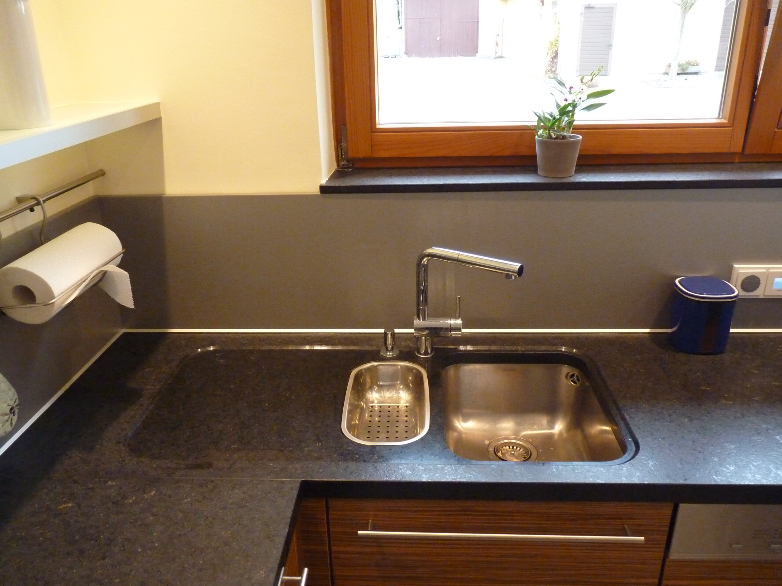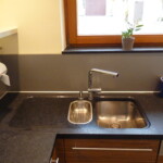 Die dunklen Arbeitsplatten mit satinierter Oberfläche in 40 mm Stärke mit den CNC-gefrästen Ausschnitten für das Unterbaubecken und das Unterbau-Restebecken sowie der Abtropffläche, präsentieren sich elegant, funktional und robust. Die Küche ist mit einem rahmenlosen Induktionskochfeld in Überbreite ausgestattet.