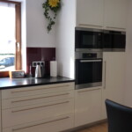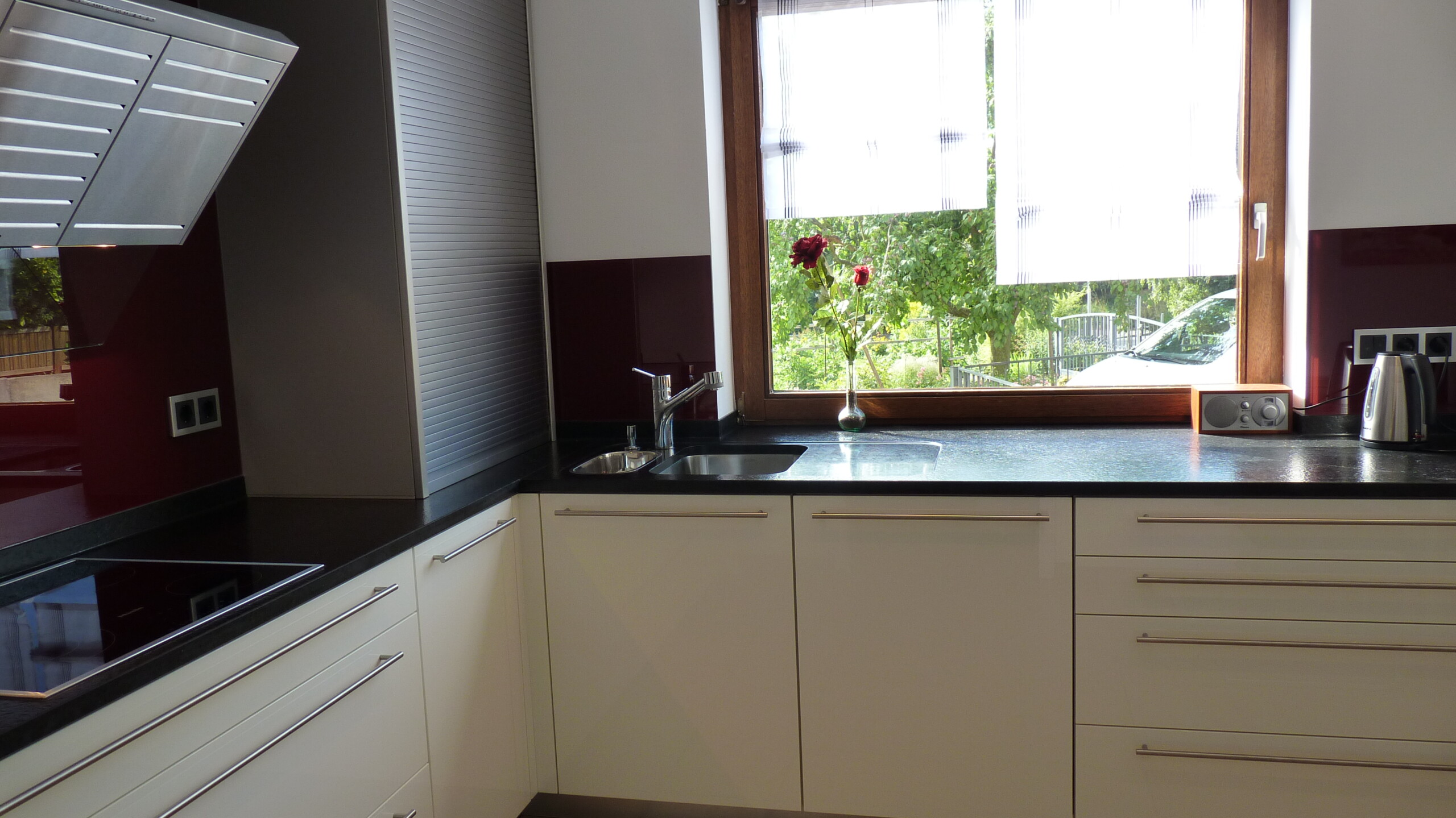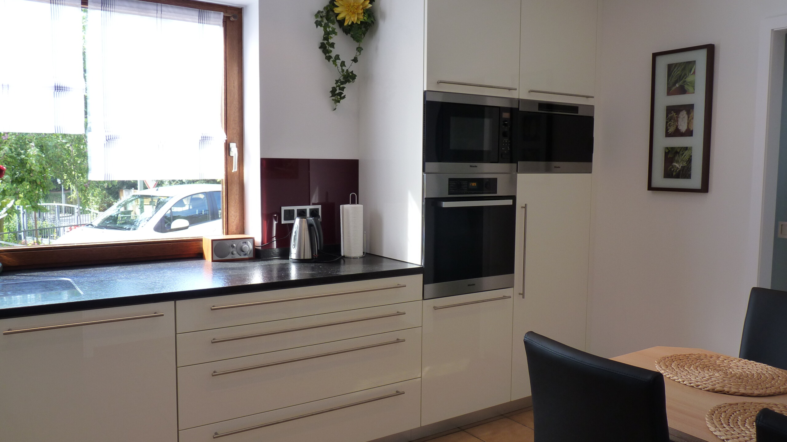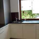 Auch bei dieser Küche sind die dunklen Arbeitsplatten mit einer satinierten Oberfläche ausgeführt, welche den natürlichen Charakter des Steins unterstreicht und gleichsam sehr pflegeleicht ist.